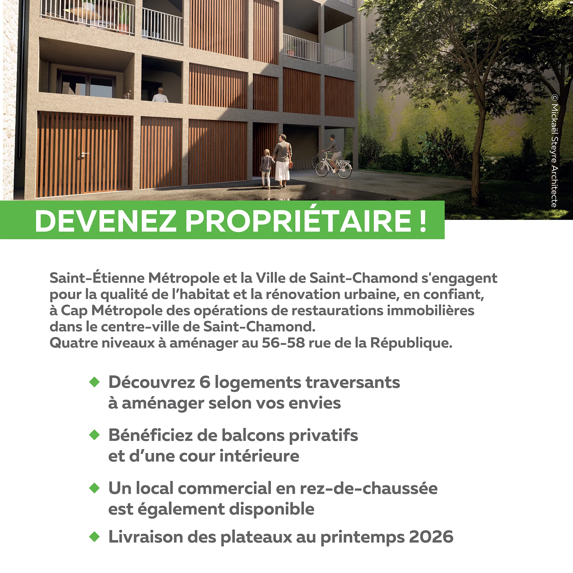 Après s’être rendue propriétaire de l’immeuble et avoir réalisé d’importants travaux, Cap Métropole propose à la vente au 56-58 rue de la République à Saint-Chamond :