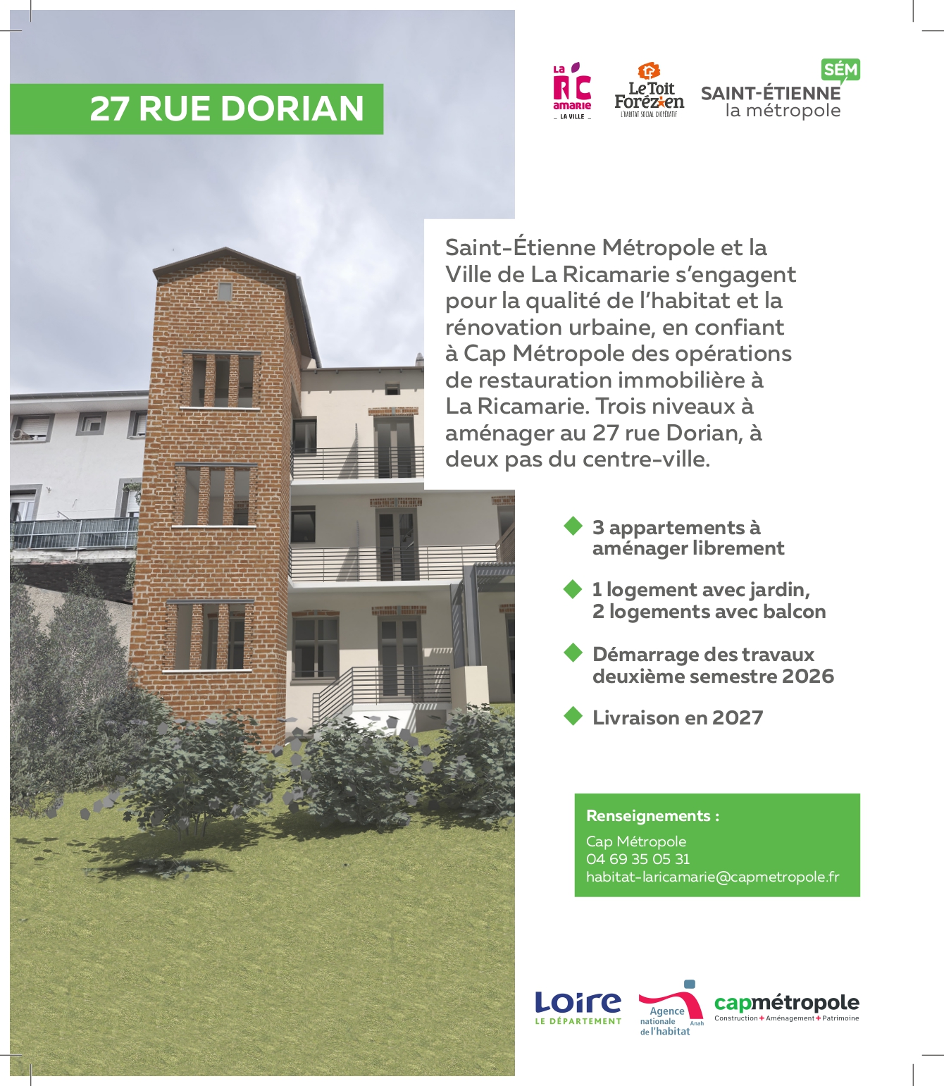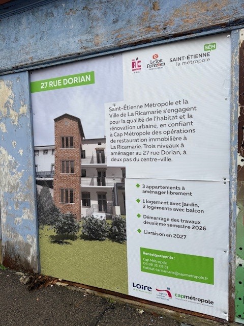 Le déploiement du processus de « recyclage immobilier » piloté par Cap Métropole, pour le compte de Saint-Étienne Métropole, franchit une nouvelle étape. A La Ricamarie, plusieurs adresses stratégiques : 5bis/7 rue de la Libération, 23/23 bis et 27 rue Dorian, ont récemment été équipées de panneaux de communication, rendant visibles les opérations en préparation et affirmant la dynamique engagée sur le secteur. A Firminy, les premiers travaux débuteront très prochainement au 8 rue de l’Orphelinat, un immeuble d’intérêt patrimonial qui va être restauré dans le but de restituer les dispositions architecturales originelles du bâtiment.